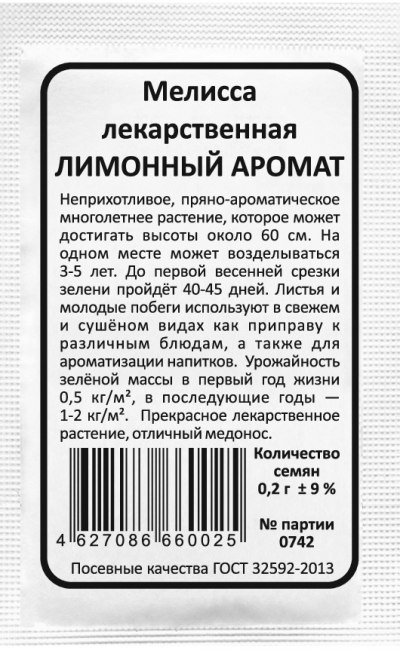МЕЛИССА лимонная Лимонный чай МЕЛИССА ЛИМОННАЯ ЛИМОННЫЙ ЧАЙ Морозостойкий, неприхотливый, многолетник высотой 80-90 см. Листья и молодые побеги обладают нежным, освежающим, лимонно-мятным ароматом и пикантным вкусом с легкой горчинкой. Используется в свежем и сушеном виде в качестве приправ к различным блюдам и добавок в прохладительные напитки. АГРОТЕХНИКА Посев в открытый грунт ранней весной. Способ посева рядовой. Между рядами 40-60 см. Всходы прореживают в рядке, оставляя между растениями 25-30 см. При использовании рассадного способа, семена высевают в конце марта в ящики по схеме 5x5 см. В открытый грунт растения высаживают в конце мая по схеме 60x30 см.Уход заключается в рыхлении, подкормках и поливе (после срезки зелени). К уборке зелени рекомендуется приступать на второй год. За сезон проводят 2-3 срезки: первую в июне, вторую через месяц.