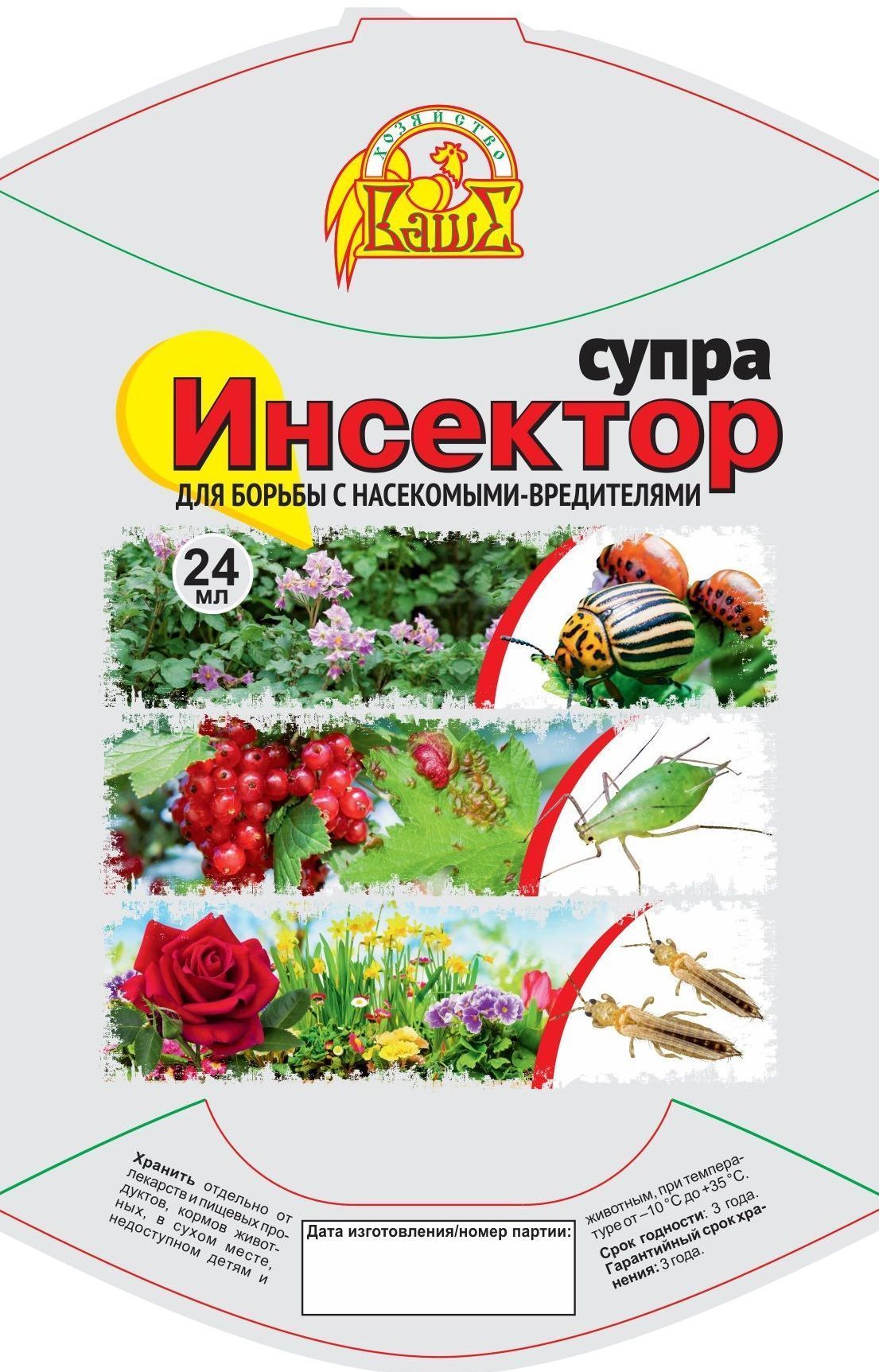 Для защиты от сосущих (тли, цикадки, белокрылка), грызущих (колорадский жук (и его личинки), пьявица, блошки) насекомых. 1,2 мл препарата достаточно для обработки 2 соток! Эффект наблюдается через несколько часов после обработки. На данный момент не отмечается резистентности к колорадскому жуку. «Инсектор» выпускается в Щвейцарии, а фасовка его осуществляется в России.