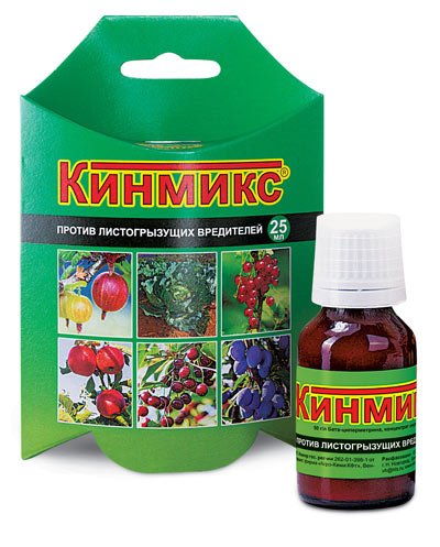 Инсектицид «Кинмикс», КЭ. Относится к группе пиретроидов, обладает низкой токсичностью для теплокровных, эффективен против большинства вредителей на основных садовых (яблоня, слива, вишня, черешня, крыжовник, смородина), а также огородных (капуста) культурах (кроме популяций вредителей, обладающих резистентностью к пиретроидам).