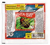 Инта-вир (д.в. 37.5 г/кг циперметрина) - инсектицид для уничтожения 52 вида насекомых вредителей в садах, огородах, теплицах. Одну таблетку растворить в 10 литрах теплой воды. опрыскивание растений проводить свежеприготовленным раствором в сухую безветренную погоду обеспечивая равномерное смачивание листьев.